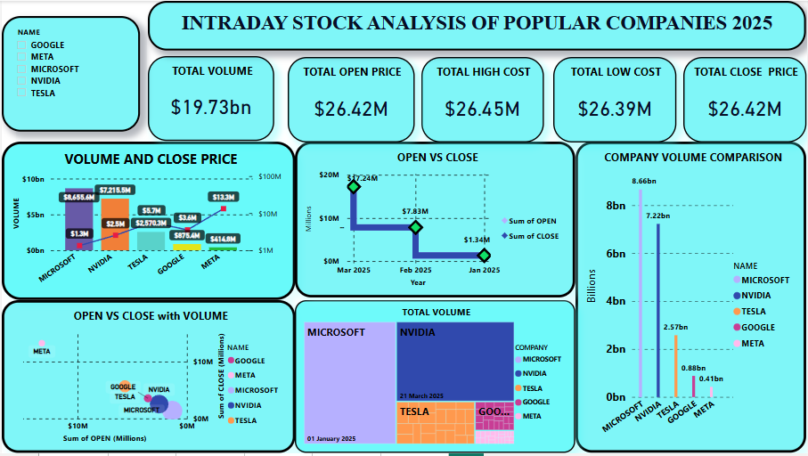 Scraped Alphavantage intraday (Financial word) stock data (1-minute interval) for Google, Meta, Microsoft, Tesla, Nvidia. Columns included Open, High, Low, Close, Volume. Visualizations using column, tree, scatter and line charts in Power BI comparing trends by volume and price.